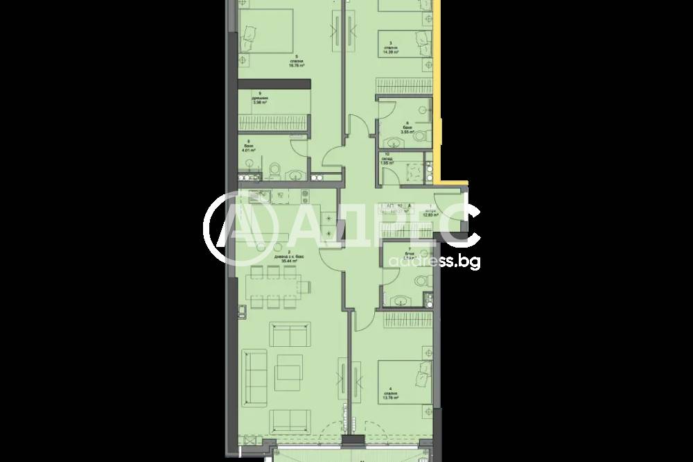 Четиристаен апартамент с изложение юг-север. Състои се от антре, дневна с кухня и трапезария, 3 спални, към едната от които баня с тоалетна и дрешник, към втората баня с тоалетна, отделно баня с тоалетна и балкон с излаз от всекидневната и едната спалня. РЗП 166,24кв.м, ЗП 140,42кв.м. Възможност за закупуване на паркомясто.