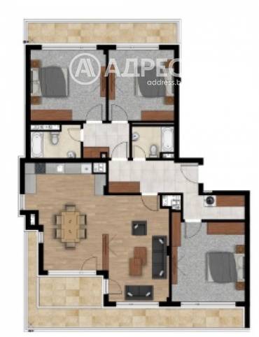 Многостаен апартамент състоящ се от дневна с кухненски бокс, три спални, две бани и две тераси. АКТ 16.