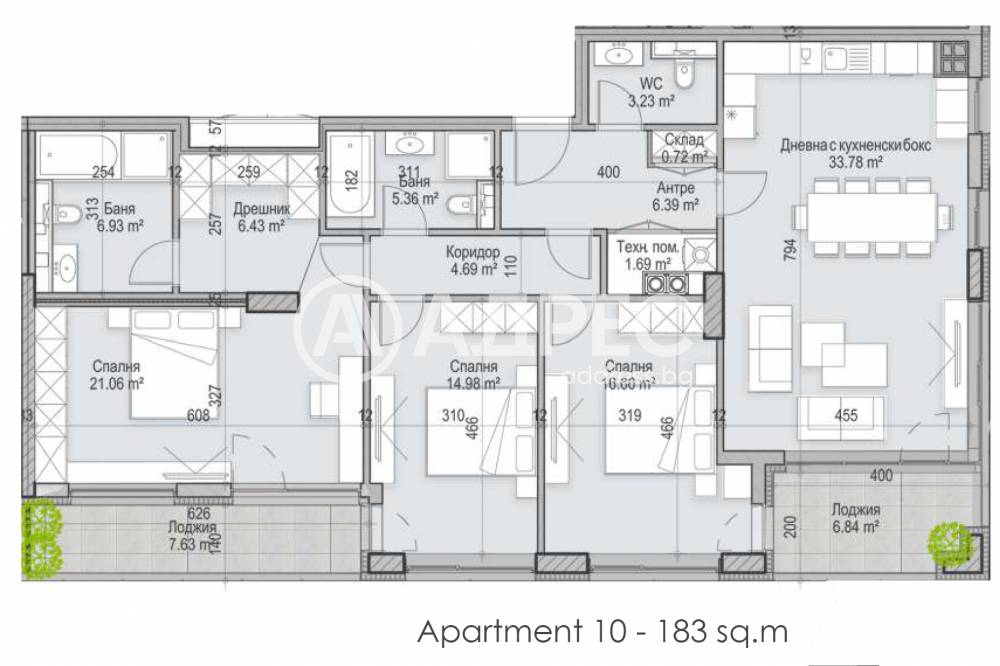 Многостаен апартамент на етаж ТРЕТИ с площ 183 кв.м. изложение Югоизток. Жилището се състои от: антре, дневна с кухненски бокс и трапезария-33м2, три големи спални, три бани с тоалетни, склад и тераса.