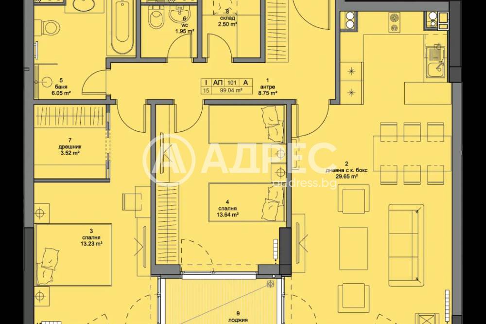 Тристаен апартамент с южно изложение. Състои се от антре, дневна с кухня и трапезария, 2 спални, към едната от които и дрешник, баня с тоалетна, отделна тоалетна, склад и балкон с излаз от двете спални и всекидневната. РЗП 117,98кв.м, ЗП 99,04кв.м. Възможност за закупуване на паркомясто.
