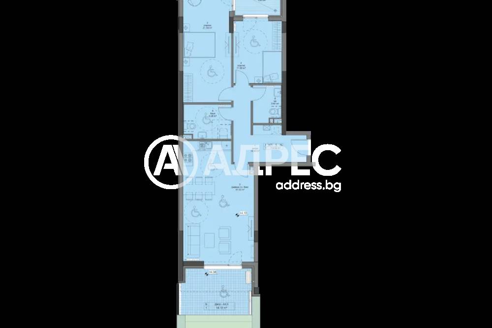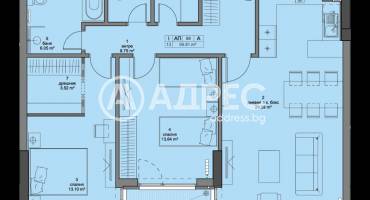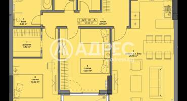 Тристаен апартамент с изложение север-юг. Състои се от антре, дневна с кухня и трапезария с излаз към двор, 2 спални с излаз на общ балкон, баня с тоалетна, отделна тоалетна, склад. РЗП 135,92кв.м, ЗП 114,82кв.м. Възможност за закупуване на паркомясто.