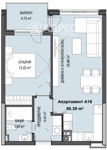 Двустаен апартамент състоящ се от антре, санитарен възел,спалня, дневна с кухненски бокс и тераса тип лоджия.