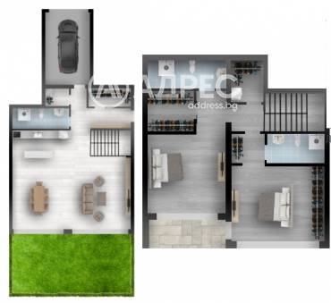 Тристаен апартамент на две нива състоящ се от дневна с кухненски бокс, Wc, гараж с топла връзка, дворна тераса на първо ниво, две спални, две бани, два дрешника и тераса на второ ниво.