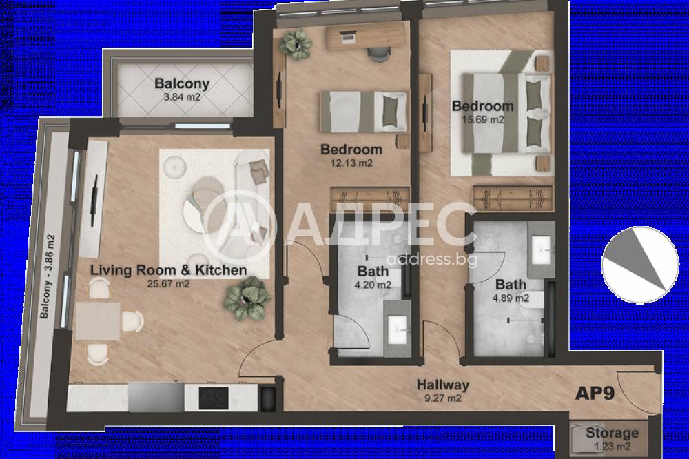 Входно антре, просторна всекидневна с кухненски бокс и трапезария, две големи спални, две бани с тоалетни, склад и две тераси!