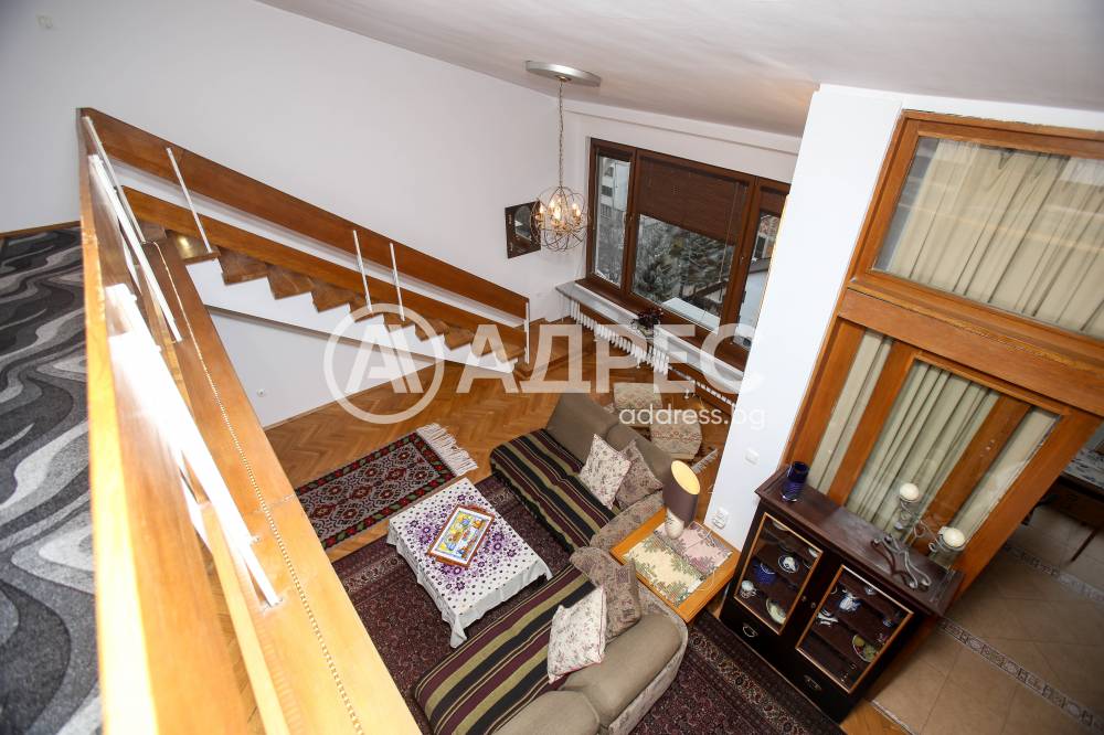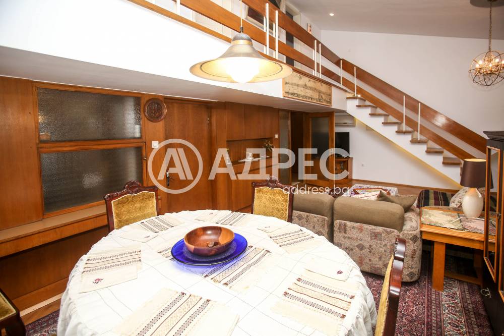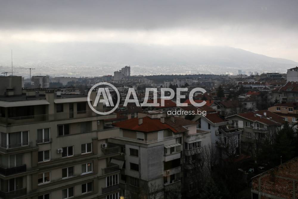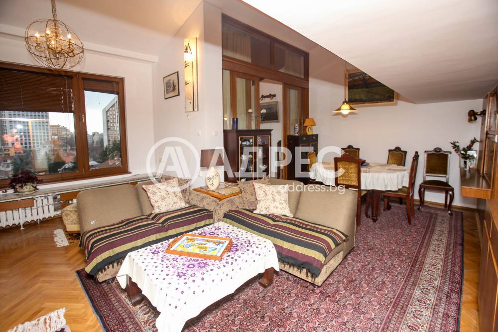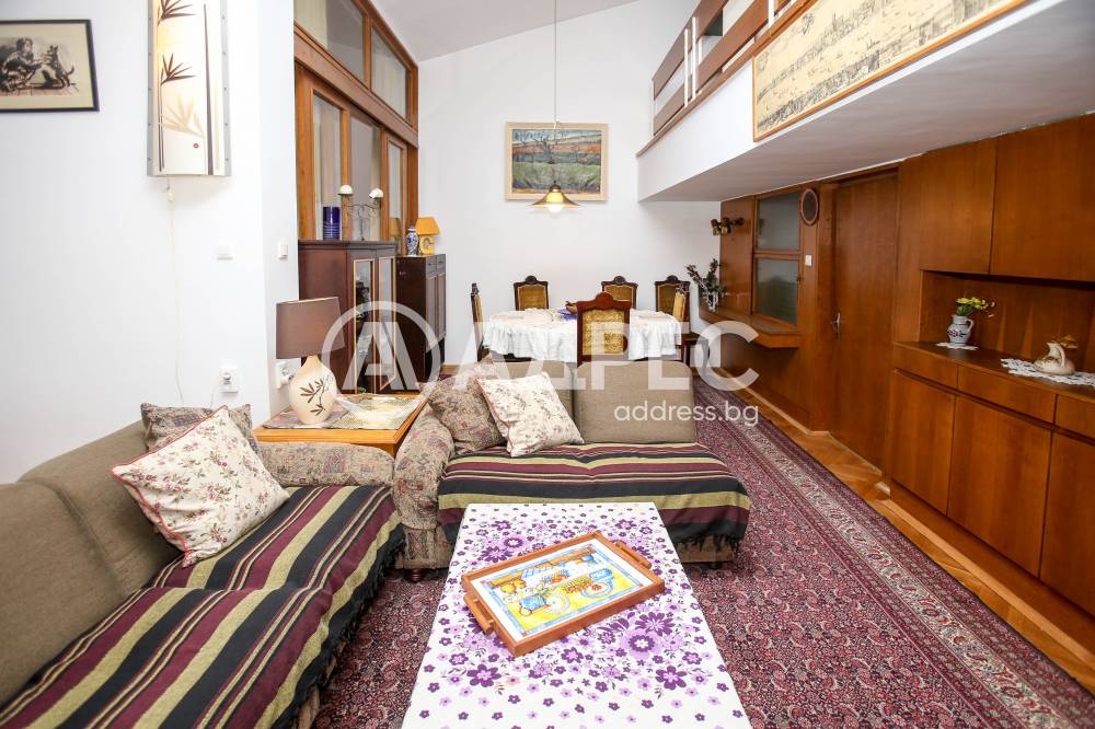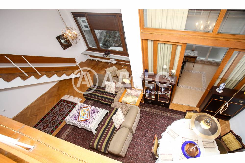 Голям многостаен апартамент, с три самостоятелни спални, едната на първо ниво, две на второ ниво, с баня и тоалетна към тях. Тераса с нескриваема гледка към Витоша, Александър Невски и Телевизионна кула. Първо ниво - голяма дневна, столова и голям кабинет за работа с френски прозорци, гледащ към градинка. Отделна кухня, мокро помещение, баня, тоалетна и голяма спалня с дрешник. Артистично, уютно с вкус обзаведено жилище. Подземен гараж 15,30кв.м. за 100е.