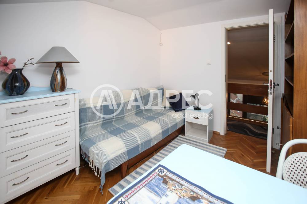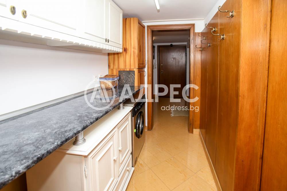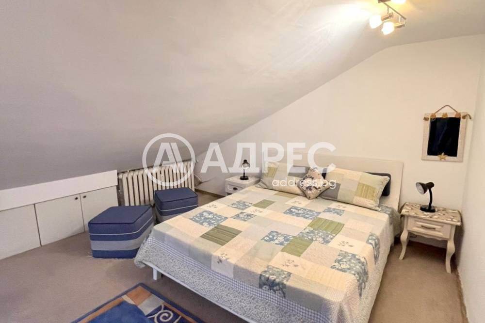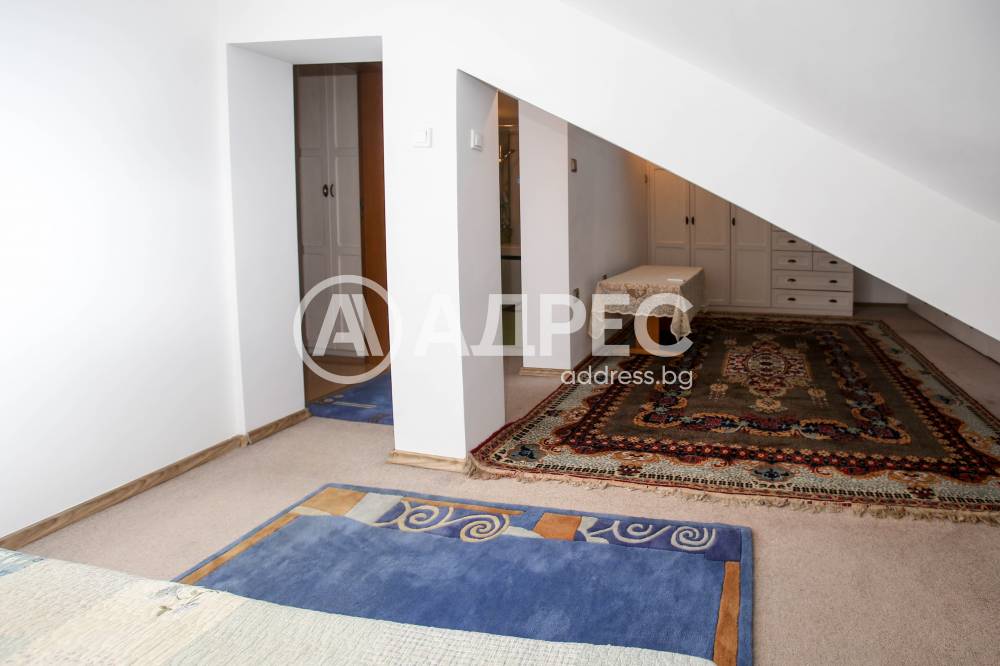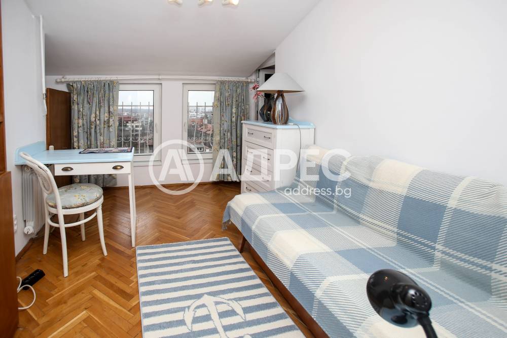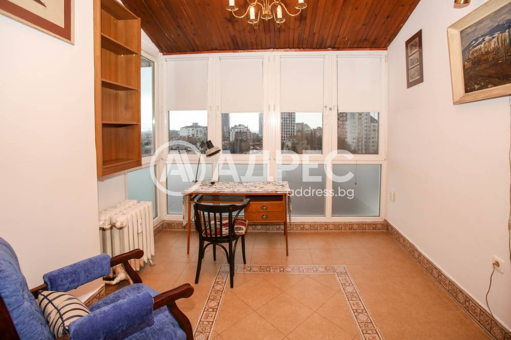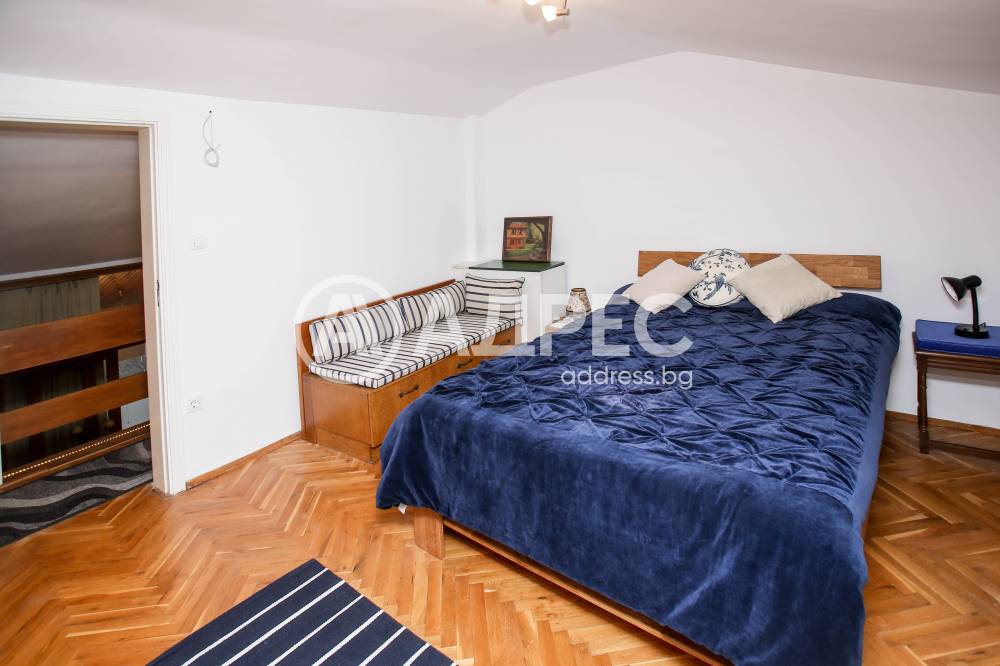 Голям многостаен апартамент, с три самостоятелни спални, едната на първо ниво, две на второ ниво, с баня и тоалетна към тях. Тераса с нескриваема гледка към Витоша, Александър Невски и Телевизионна кула. Първо ниво - голяма дневна, столова и голям кабинет за работа с френски прозорци, гледащ към градинка. Отделна кухня, мокро помещение, баня, тоалетна и голяма спалня с дрешник. Артистично, уютно с вкус обзаведено жилище. Подземен гараж 15,30кв.м. за 100е.