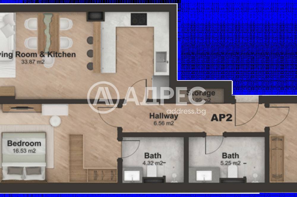 Входно антре, просторна всекидневна с кухненски бокс и трапезария, две големи спални, две бани с тоалетни, склад и тераса!