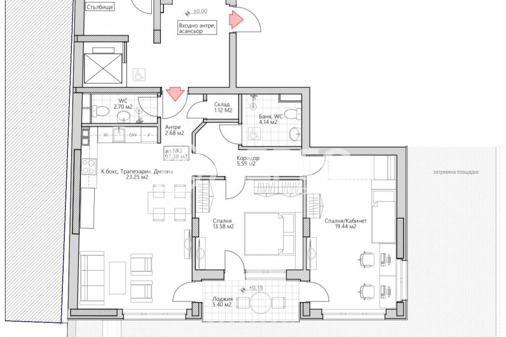 непреходни спални, баня с тоалетна, тоалетна и склад. Изложенията са югоизток, североизток. Жилището ще бъде предадено на шпакловка и замазка. Отопление - термопомпа. Към апартамента има подарък - 45кв.м. двор! Възможност за покупка на паркоместа - EUR 30 000.