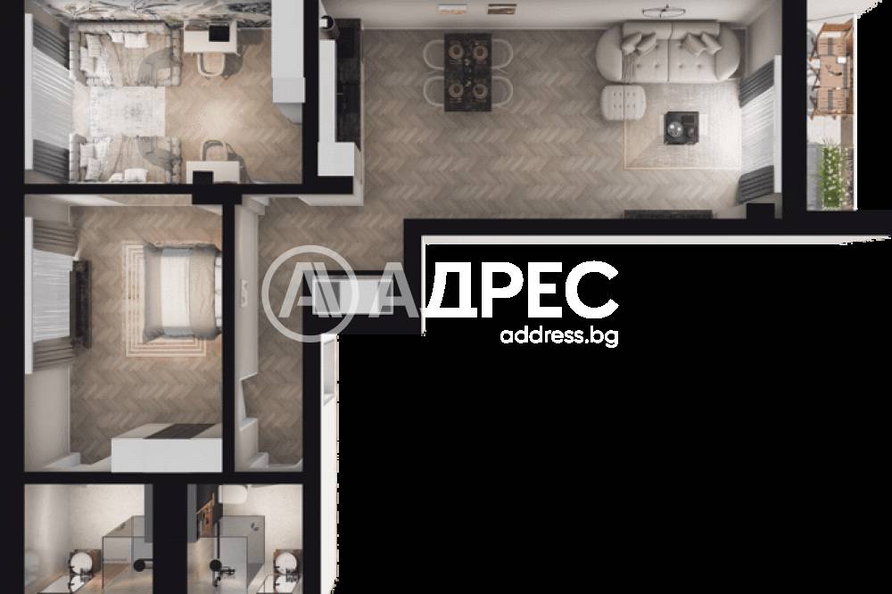 Представяме Ви изискан тристаен апартамент, проектиран с внимание към детайла и усещане за простор и комфорт. Основното помещение е впечатляваща дневна с площ от 32,35 кв.м, изпълнена със светлина и създаваща перфектна среда за отдих, прием на гости и стилен начин на живот.