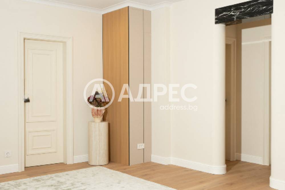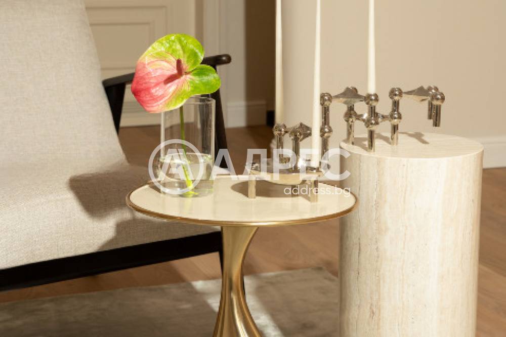 Апартаментът е изцяло реновиран по дизайнерски проект, с използване на висококачествени естествени материали – естествен паркет във всички помещения и мраморни облицовки в баните. Имотът се предлага готов за довършително обзавеждане, което да позволи на новите собственици да го оформят според своя стил и предпочитания.