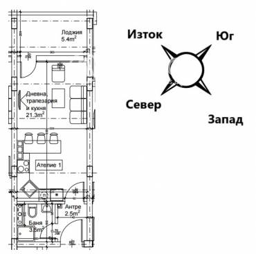 Едностайно ателие със застроена площ от 40,09 кв.м., състоящо се от входно антре, дневна с кухненски бокс, баня с тоалетна и балкон.