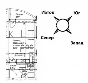 Едностайно ателие със застроена площ от 32,12 кв.м., състоящо се от входно антре, дневна с кухненски бокс, баня с тоалетна и блакон. Към ателието има прилежащ склад в сутерена на сградата с площ от 2,94 кв.м.
