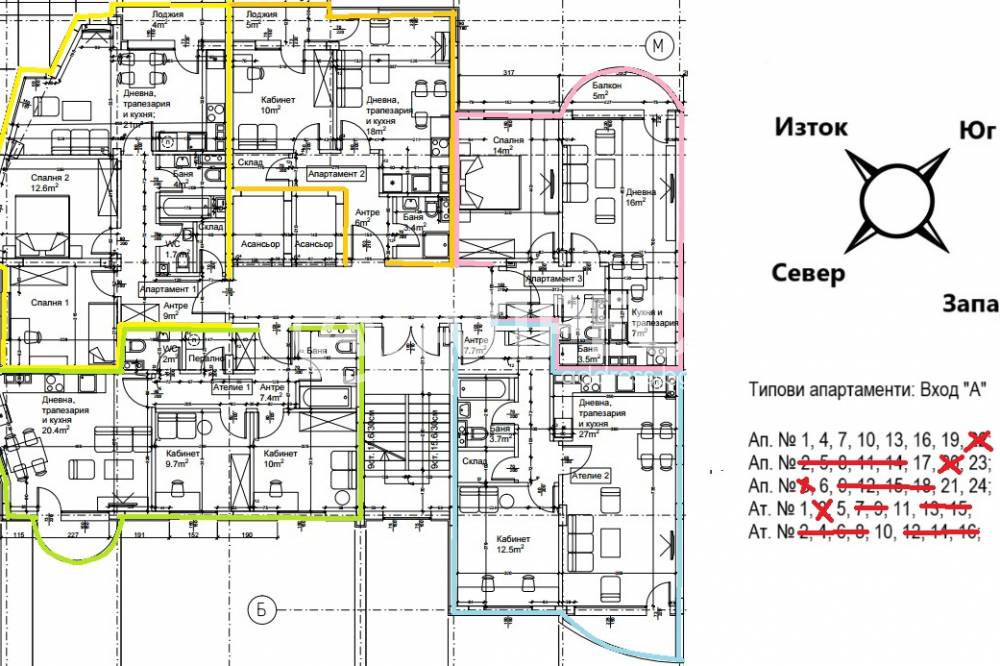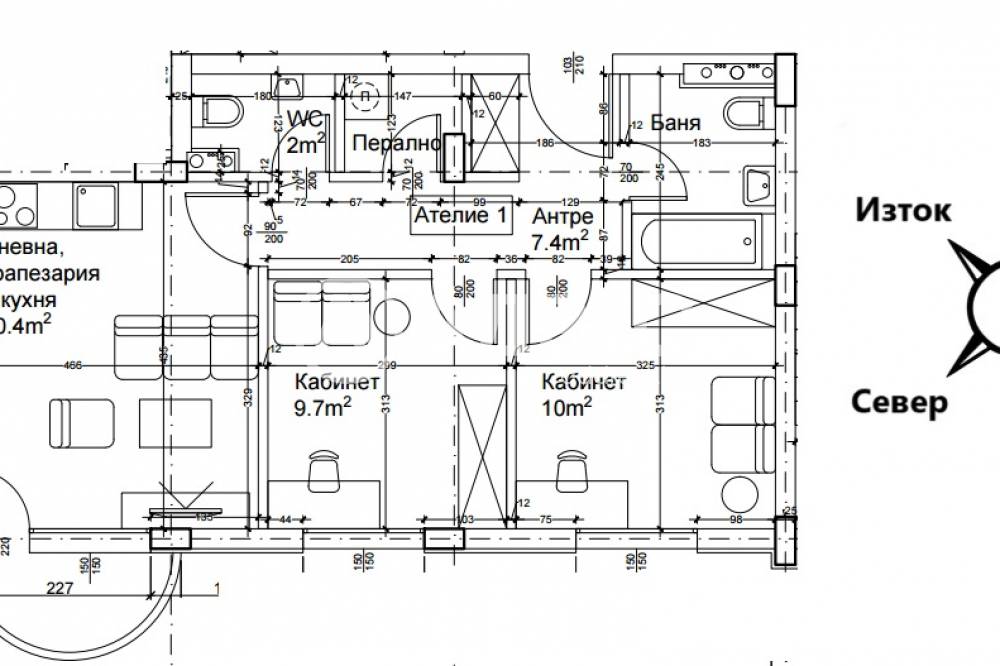 Тристайно ателие със застроена площ от 69,5 кв.м., състоящо се от входно антре, дневна с кухненски бокс, две спални, баня с тоалетна, отделна тоалетна, мокро помещение и балкон.