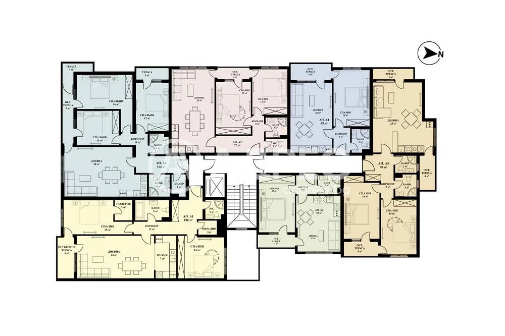 Тристаен апартамент, състоящ се от: коридор, дневна с кухненски бокс 31 кв.м., родителска спалня с гардеробно помещение 18 кв.м., детска стая 14 кв.м., тераса и две бани с тоалетни. Изложението е юг-изток. В цената е вкючено външно паркомясто!!!