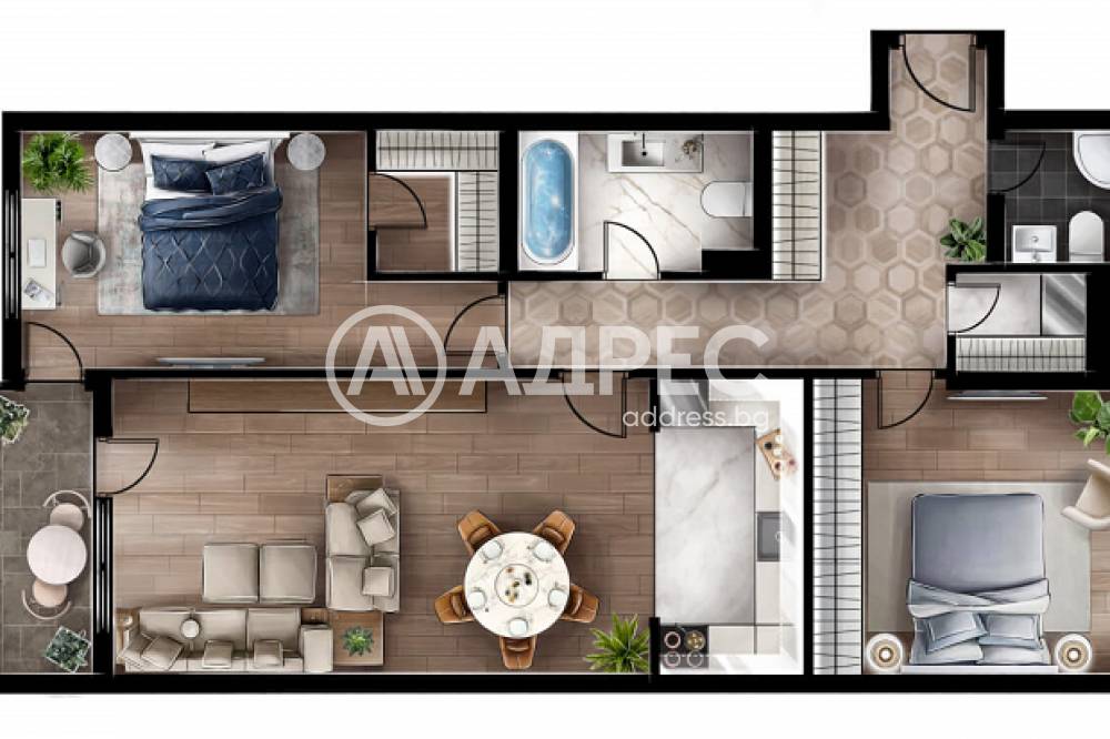 Тристаен апартамент, състоящ се от: коридор, дневна с кухненски бокс 31 кв.м., родителска спалня с гардеробно помещение 18 кв.м., детска стая 14 кв.м. и две бани с тоалетни. Изложението е юг-изток. Външно паркомясто включено в цената!!!