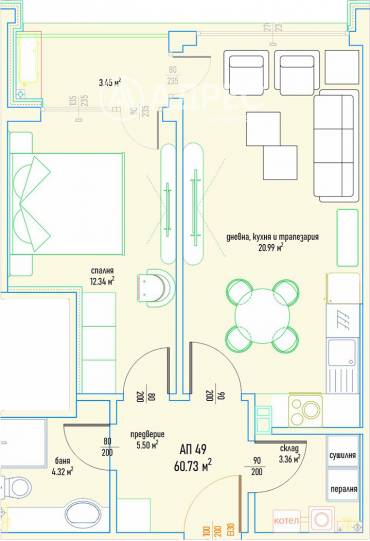 Двустаен апартамент на етаж шести със ЗП-58,77м2; РЗП-72,26м2, изложение С/И.. Разпределение; антре, дневна с кухненски бокс и трапезария, спалня, баня с тоалетна, мокро и тераса. Предвидено е отопление на газ и климатици. Обособени подземни паркинги на две нива. Комплексът ще бъде с осигурен бърз достъп до околовръстен път.