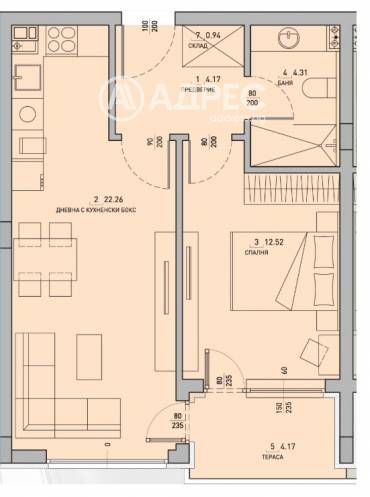 Двустаен апартамент със застроена площ от 56,67 кв.м. Апартаментът се състои от: входно антре, дневна с кухненски бокс, спалня, баня с тоалетна, склад и тераса.