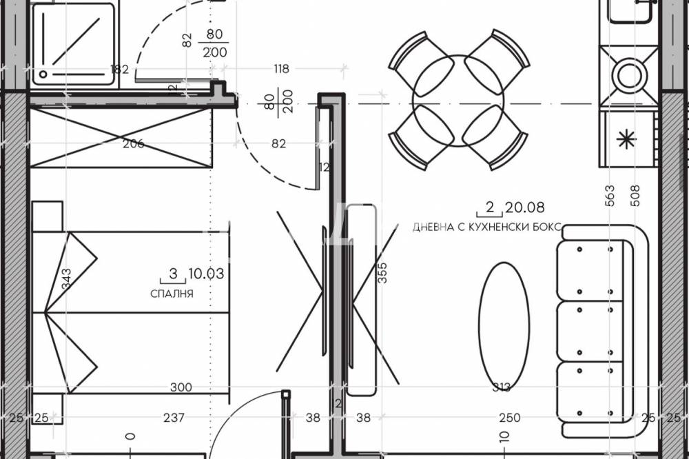 хол с кухненски бокс, спалня, баня с тоалетна, ложия.