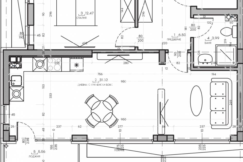 хол с кухненски бокс, спалня, баня с тоалетна, ложия.