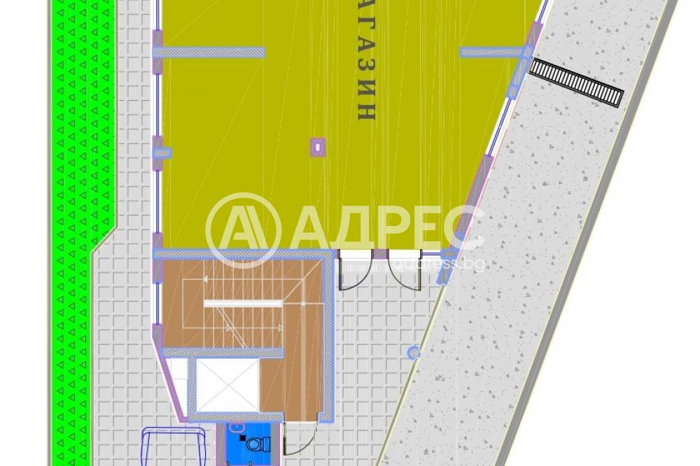 Магазин, разположен на кота ±0.00, със застроена площ 130,99 кв.м. Обектът се намира на партерно ниво на сградата и включва търговска зала, складово помещение и сервизни помещения. Достъпът до магазина е директен от улично ниво, чрез самостоятелен вход, осигуряващ удобство за посетители и товаро-разтоварни дейности. Фасадното остъкление позволява добра видимост към търговската площ. Обектът е подходящ за развиване на търговска дейност, офис, студио за услуги или друг вид обслужващи функции.