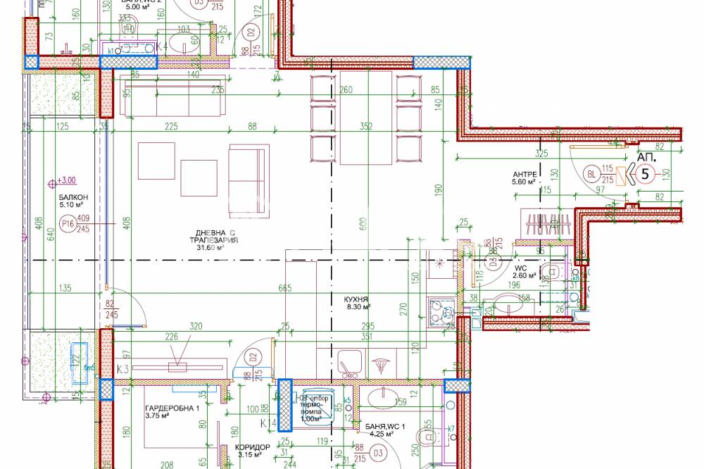 Многостаен апартамент на етаж втори/ първи етаж над партер със ЗП-146,5м2; РЗП-168,83м2- Дневна с кухненски бокс и трапезария-39,9м2, три големи спални, две бани, тоалетна, гардеробна, място за термопомпа и просторен балкон-5,10м2. Изложение С/Ю/З. Налични ПМ и гаражи.