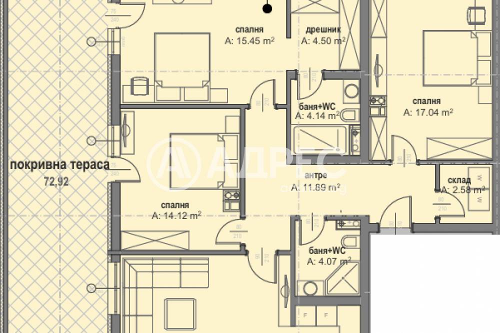 Многостаен апартамент с обща площ 153.32 кв.м /ЗП 130.22кв.м. + ОЧ 23.10кв.м./ + покривна тераса 72.92 кв.м