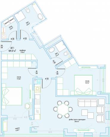 Тристаен апартамент на ПЪРВИ етаж със ЗП 109,37м2, изложение ЮГ и разпределение: антре, дневна с кухненски бокс и тарапезария, две спални, две бани с тоалетна, килер/мокро и балкон.