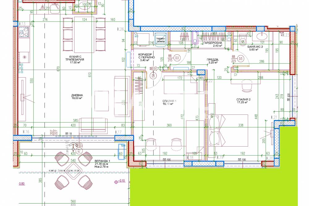 Тристаен апартамент на партерен етаж със ЗП-107,3м2; РЗП-123,66м2 и собствен двор-369м2. Дневна с кухненски бокс и трапезария-36,5м2, две големи спални, две бани, гардеробна, място за термопомпа и просторна веранда-21,30м2. Изложение Ю/И. Налични ПМ и гаражи. Сградата е с АКТ 14.