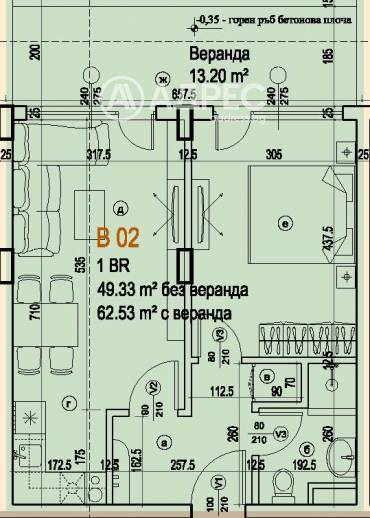 Двустаен апартамент с веранда. Изложение Запад. Апартамента е със застроена площ 62,53 кв.м, от които антре 6.06кв.м, баня+WC 4,80кв.м, килер 0,79кв.м, всекидневна 22,51кв.м, спалня 15,18кв.м, веранда 13,20кв.м и обща квадратура 68,99кв.м.