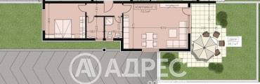 Апартаментът има следното разпределение: антре, хол с кухненски бокс, спалня, баня и две дворни тераси с площ 118 м2.