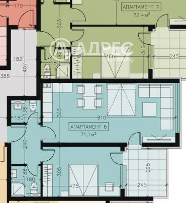 Апартаментът е със ЗП 71 м2 и има следното разпределение: антре, хол с кухненски бокс, спалня, две бани и тераса.