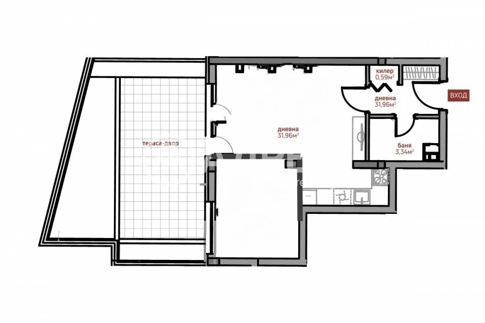 Разпределението позволява обособяване на светла дневна с кухненски бокс, самостоятелна спалня, баня с тоалетна и входно антре. Пространството е гъвкаво и дава възможност за модерни интериорни решения според нуждите на бъдещия собственик.