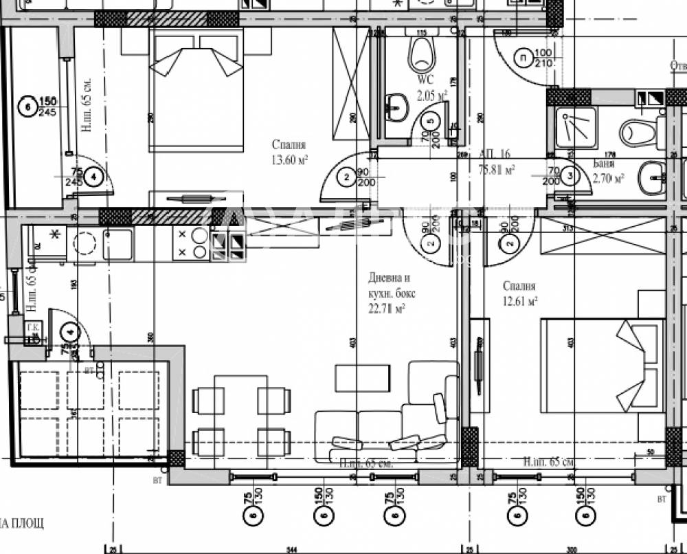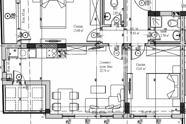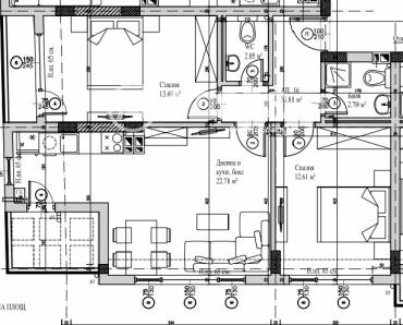 Тристаен апартаменнт в новострояща се сграда с АКТ 14, състоящ се от дневна с кухненски бокс, две спални, баня с тоалетна, тоалетна, антре и две тераси.