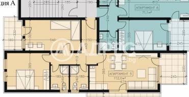 Апартаментът е със ЗП 111 м2 и има следното разпределение: антре, хол с кухненски бокс, две спални, две бани и две тераси.