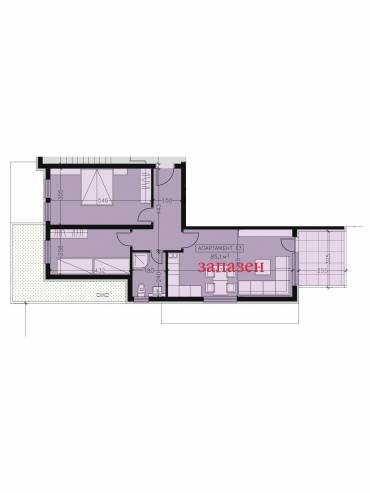 Апартаментът има следното разпределение: антре, хол с кухненски бокс, две спални, баня и тераса.