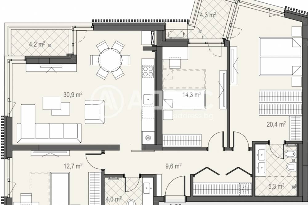 Многостаен апартамент с югозападно изложение и площ от 143 кв.м. Състои се от просторен хол с кухненски бокс, три големи спални, едната със самостоятелна баня с WC, втора баня с WC, две тераси. Сграда на доказан Инвеститор.