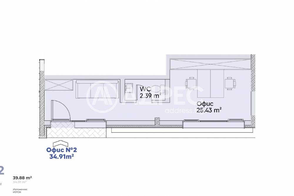 Офис на партерно ниво с РЗП-39,88 м2 и ЗП-34,91м2, сътоящ се от едно помещение с обособени зони, санитарно помещение и една тераса. Изводи за термопомпа, при желание може и подово отопление. подземни ПМ и гаражи.