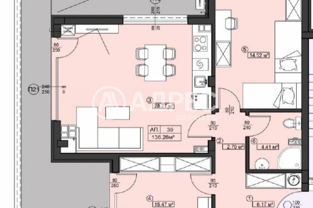 Тристаен апартамент сътоящ се от: антре, дневна с кухненски бокс, две спални, две бани с тоалетна и тераса.