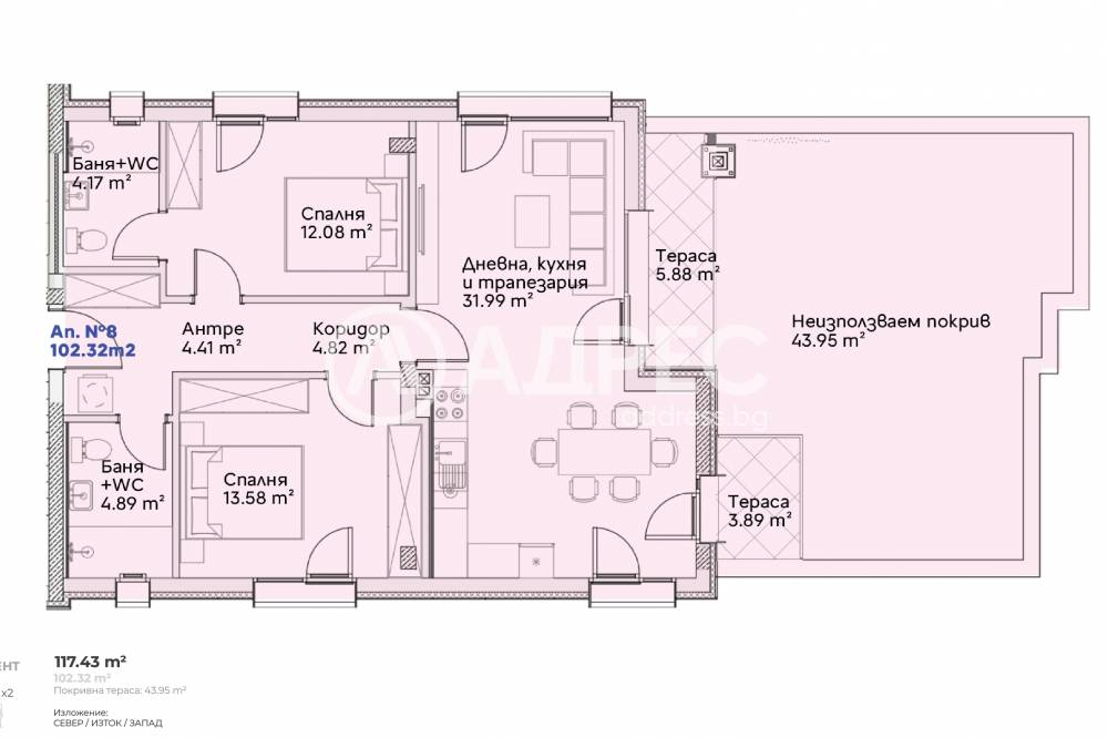 Тристаен апартамент с РЗП-117,43м2, ЗП-102,32м2 със следното разпределение: на етаж трети са разположени: антре, дневна с трапезария и кухненски бокс-31,99м2, спалня -12,08м2 с баня с тоалетна към нея-4,17м2, втора спалня-13,58м2, още една баня с тоалетна-4,89м2. Ползване на покривна тераса-43,95м2. Изводи за термопомпа, при желание може и подово отопление. Подземни ПМ и гаражи.