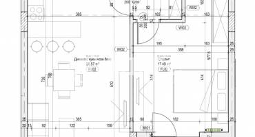 ДВУСТАЕН АПАРТАМЕНТ с площ от 77,48 кв.м. Състои се от: коридор, дневна зона с кухненски бокс 25,76 кв.м., спалня 12,56 кв., баня с WC и лоджия.Изложението е юг-изток. Има възможност за закупуване на подземно паркомясто или гараж!