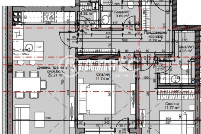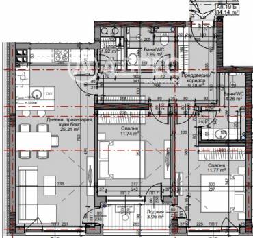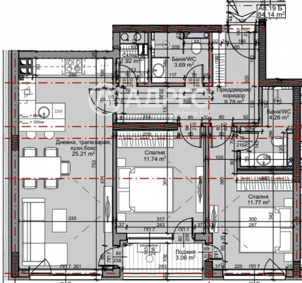 С АКТ 14. Функционален тристаен апартамент. Разположен е на осми етаж. Състои се от: хол с трапезария и кухненски бокс с площ 25.21 кв.м., две спални по 11.74 кв.м. и 11.77 кв.м., две санитарни помещения, балкон и склад. Изложението е югоизточно. Има възможност за покупка на гараж или паркомясто.
