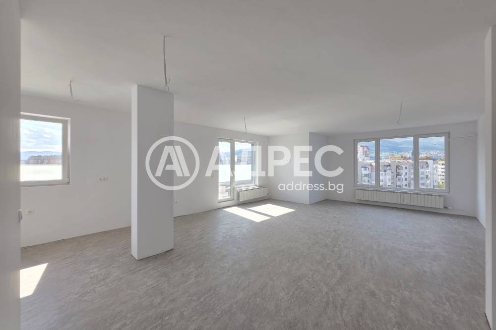 Огромен панорамен тристаен апартамент. Състои се от 50 кв.м. хол с южно и западно изложение и нескриваема гледка към планина Витоша, две големи самостоятелни спални по 25 кв.м. и 15 кв.м. с източно изложение, голяма панорамна тераса пред тях, санитарни помещения и коридори.