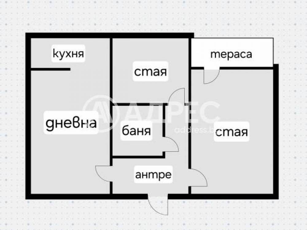 Тристаен апартамент със следното разпределение:коридор, всекидневна с кухненски бокс, две спални, баня с тоалетна, тераса.