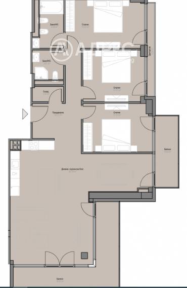 Четиристаен апартамент, състоящ се от: входно преддверие, дневна с трапезария и кухненски бокс, три спални, две бани с тоалетни, тераси и складово помещение.