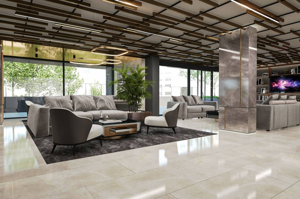 Затвореният комплекс разполага със собствен вътрешен парк, озеленени интериорни пространства и общи тераси за отдих и забавление. На партерно ниво са предвидени супермаркет, козметичен център, магазини и фитнес на две нива.