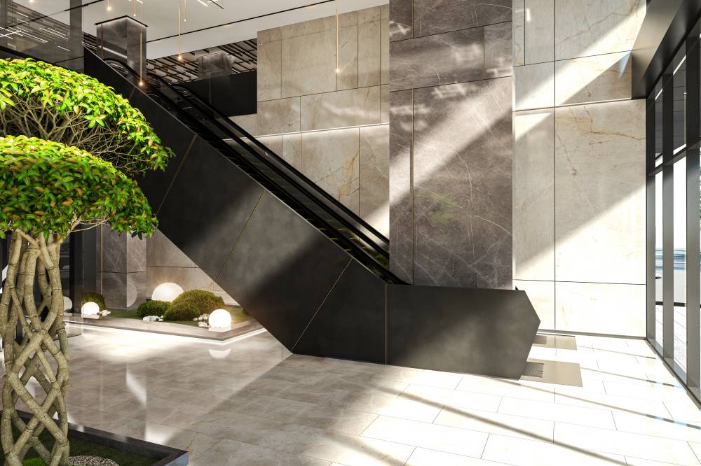 Достъпът до жилищната част се осъществява, както през индивидуални входове, така и посредством рецепция. Сред отличителните удобства на сградата са панорамен асансьор и 2 броя ескалатори, които водят до вътрешния двор и фитнеса.