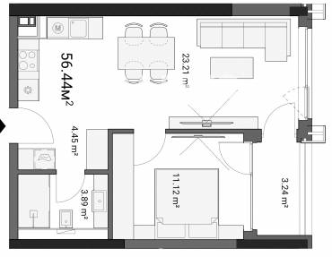 Двустаен апартамент . От входно антре с място за склад се влиза в Дневна зона - 26кв.м, която може да се зонира на кухненски бокс с трапезария и холна част; спалня ; тераса; баня с тоалетна. Апартаментът е със статут на Ателие поради неблагоприятно изложение. Бюджетен вариант подходящ за инвестиция с цел отдаване под наем.