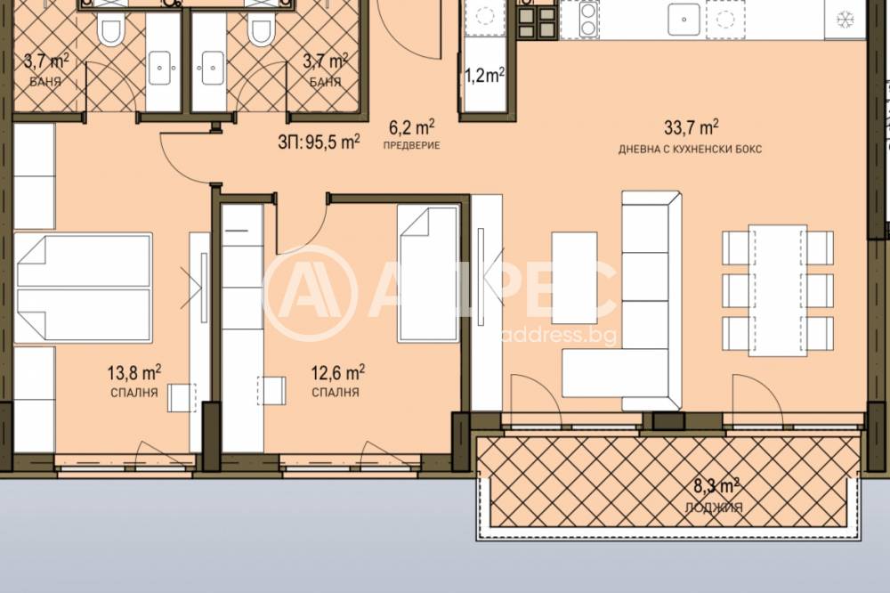 кухненски бокс и трапезария, две спални, две бани с тоалетна, мокро