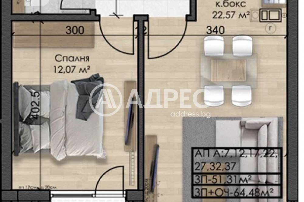 Апартамента се намира на ет.2 над гаражи с изложение север/запад със застр.площ от 51.31 кв.м 64.48 кв.м с общи части. Състои се от антре 4 кв.м, дневна с кухненски бокс 22.57кв.м ,спалня 12 кв.м с тераса 3.20 кв.м и баня с тоалетна 3.01 кв.м. Посочените квадратури са чистата светла площ на помещенията. Има апартаменти със същото разпределение и на горните етажи,като цената е според етажа. На горния етаж е 2400е на кв.м на ет.4 ,2500е на кв.м и така до ет.9. Отоплението предвидено за всеки 1 ап е с изводи за индивидуални газови котлета и изградени трасета за климатици сплит система във всяка стая и изводи за главния климатик на терасата. В градата има още много варианти на 2стайни и 3 стайни апартаменти, като съществува и вариант за обединение на апартаменти. Сградата е с акт 14 от миналата година. Акт 16 се предвижда преди края на 2026г.