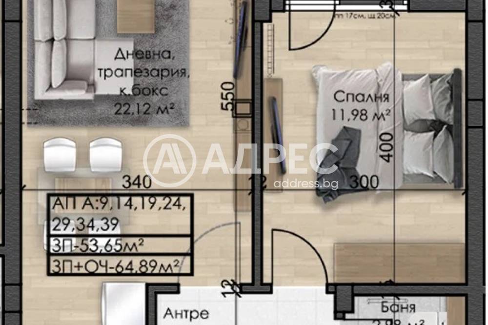 Апартамента се намира на ет.2 над гаражи с изложение югоизток със застр.площ от 53.65 кв.м 65.24 кв.м с общи части. Състои се от антре 4.73 кв.м, дневна с кухненски бокс 22.12кв.м ,спалня 12 кв.м с тераса 3.32 кв.м и баня с тоалетна 3 кв.м. Посочените квадратури са чистата светла площ на помещенията. Има апартаменти със същото разпределение и на горните етажи,като цената е според етажа. На горния етаж е 2400е на кв.м на ет.4 ,2500е на кв.м и така до ет.9. Отоплението предвидено за всеки 1 ап е с изводи за индивидуални газови котлета и изградени трасета за климатици сплит система във всяка стая и изводи за главния климатик на терасата. В градата има още много варианти на 2стайни и 3 стайни апартаменти, като съществува и вариант за обединение на апартаменти. Сградата е с акт 14 от миналата година. Акт 16 се предвижда преди края на 2026г.